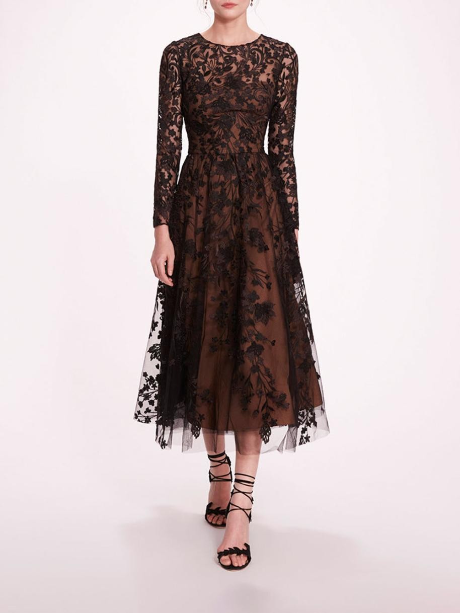 긴 소매 튤 미디 드레스로 세련된 스타일을 완성하세요. 시스루 튤 소재에 섬세한 자수 장식, 몸에 꼭 맞는 보디스, 그리고 플라운스 스커트가 돋보이는 이 매혹적인 드레스는 우아함과 세련미의 균형을 자연스럽게 조화시켰습니다.