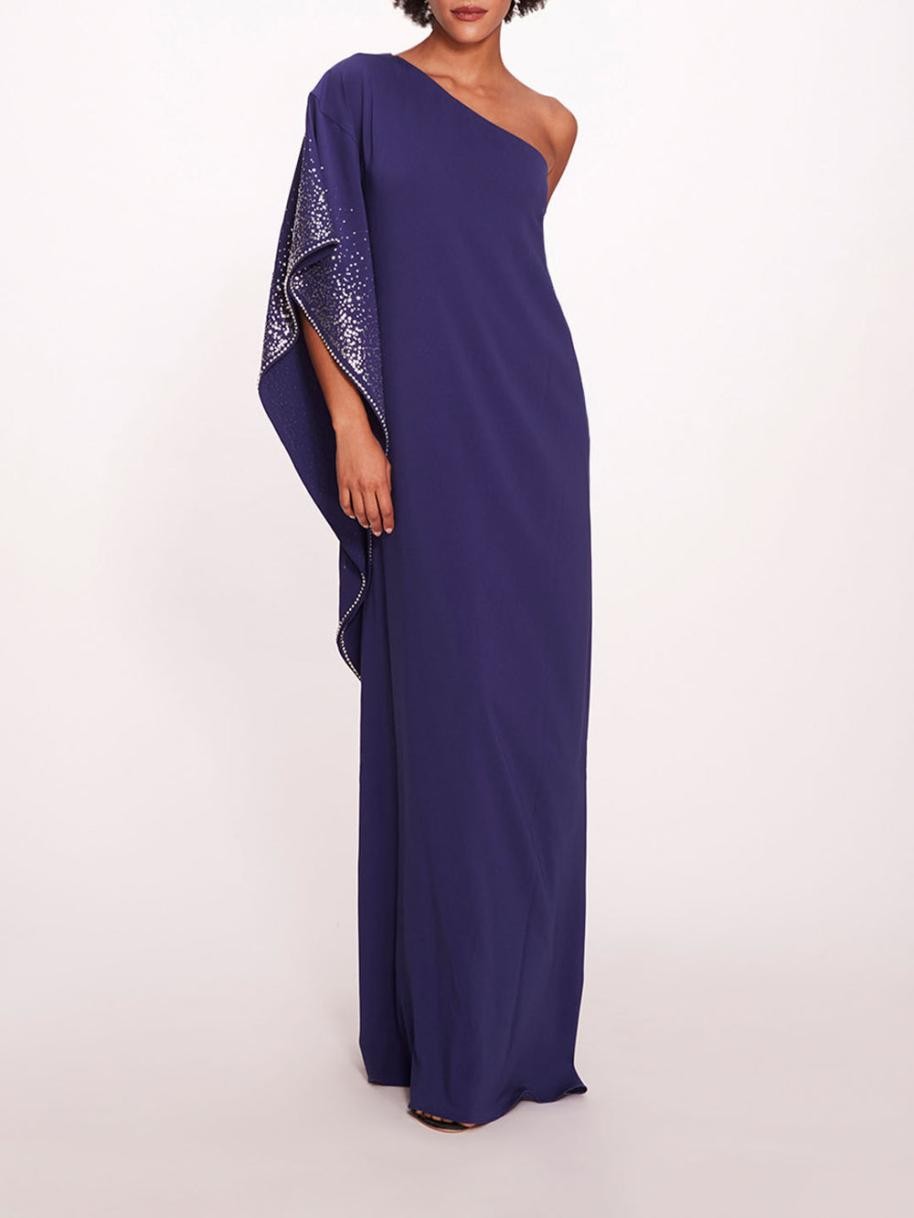 원숄더 카프탄은 소매에 반짝이는 디테일이 들어간 긴팔 크레이프 카프탄으로, 원숄더입니다.