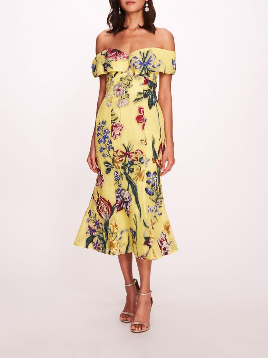 알렉산더 미디 드레스는 오프숄더 미디 핏투플레어 플로럴 필 쿠페 드레스입니다.