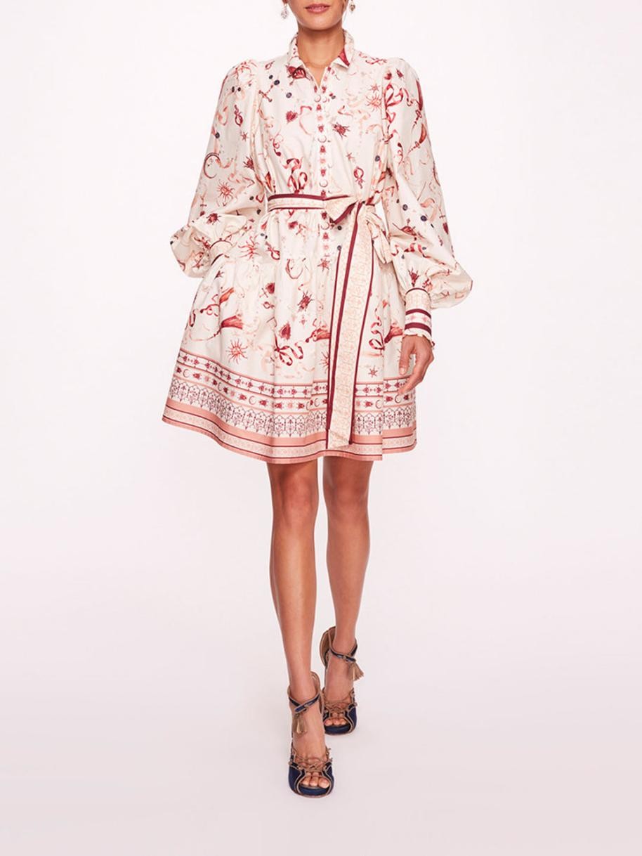 실반 드레스는 커프스 소매와 스카프가 인쇄된 코튼 소재의 별도 벨트가 달린 단추 달린 긴팔 스윙 드레스입니다.