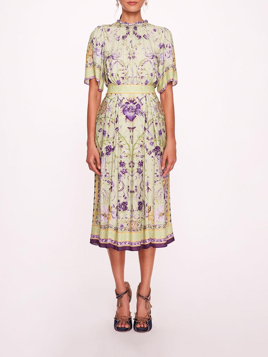 소마 드레스는 스카프가 프린트된 레이온 소재의 반팔 미디 드레스로, 주름 장식이 있는 네크라인과 스모크 장식이 있는 허리선이 특징입니다.