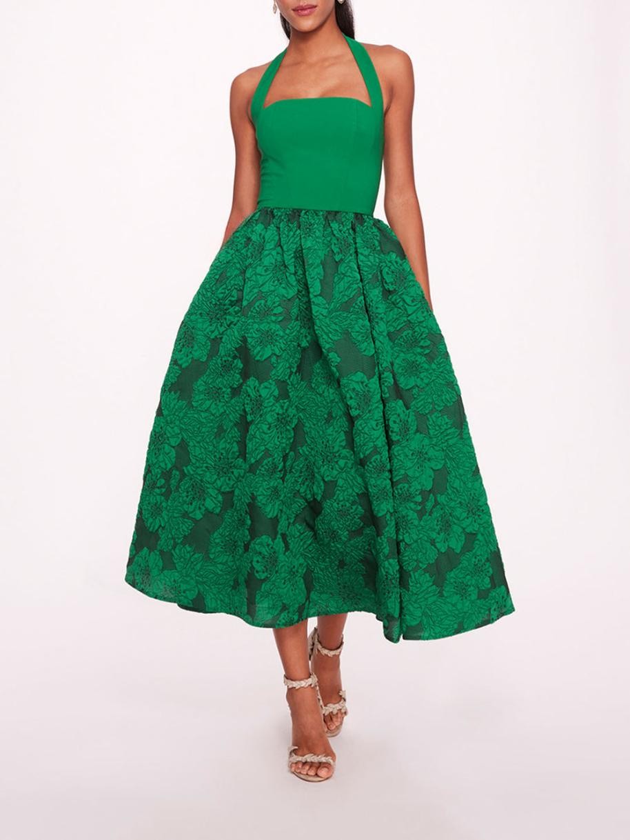 칼라테아 홀터 드레스는 스트레치 크레이프 보디스와 가벼운 클로케 소재의 풀 스커트로 디자인된 홀터 미디 드레스입니다.