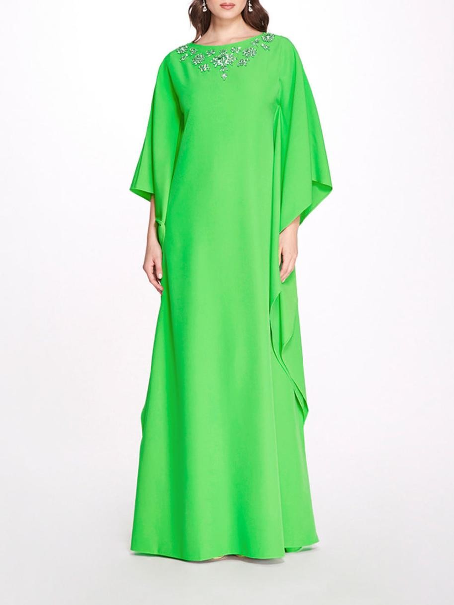 크리스털 장식 카프탄은 보트넥과 드레이프 소매가 특징입니다. 크레이프 드레스의 네크라인에는 크리스털 장식이 섬세하게 장식되어 있습니다.