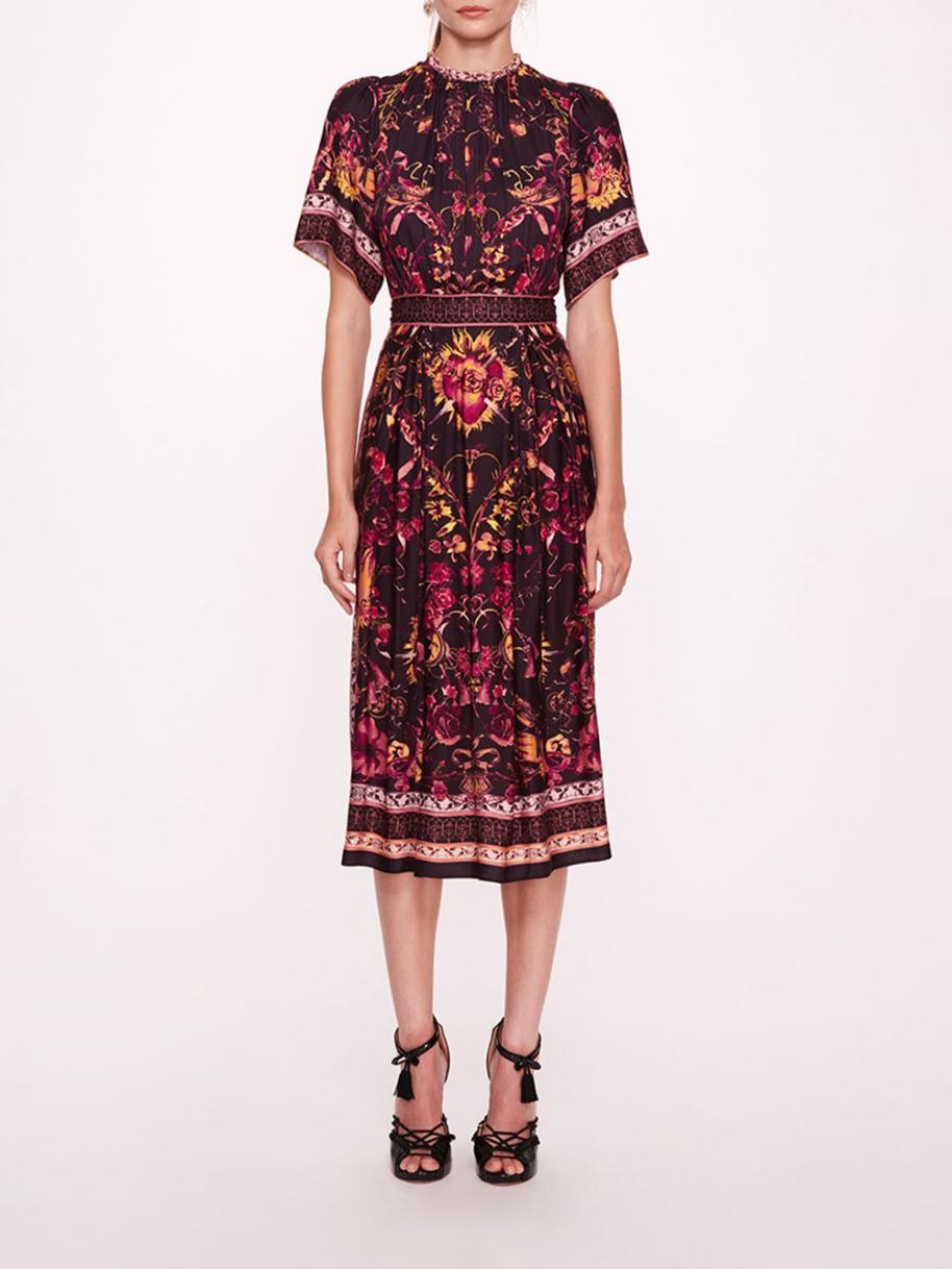 소마 드레스는 짧은소매미디 드레스로, 스카프 프린트 레이온 소재에 주름 장식이 있는 네크라인과 스모크 장식이 있는 허리선이 특징입니다.