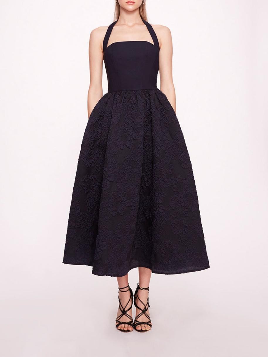 칼라테아 홀터 드레스는 스트레치 크레이프 보디스와 가벼운 클로케 소재의 풍성한 스커트로 디자인된 홀터 미디 드레스입니다.