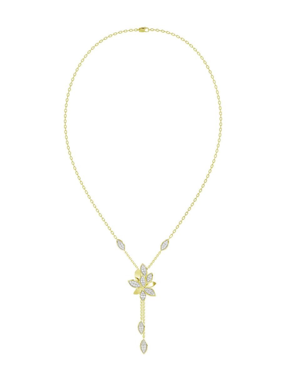 와일드플라워옐로우 골드 Y 네크리스는 18캐럿 옐로우 골드 체인으로, 중앙에는 역동적인 눈물방울 모양 다이아몬드와 옐로우 골드 꽃이 세팅되어 있습니다. 체인에는 아몬드 모양의 천연 다이아몬드가 장식되어 있습니다.