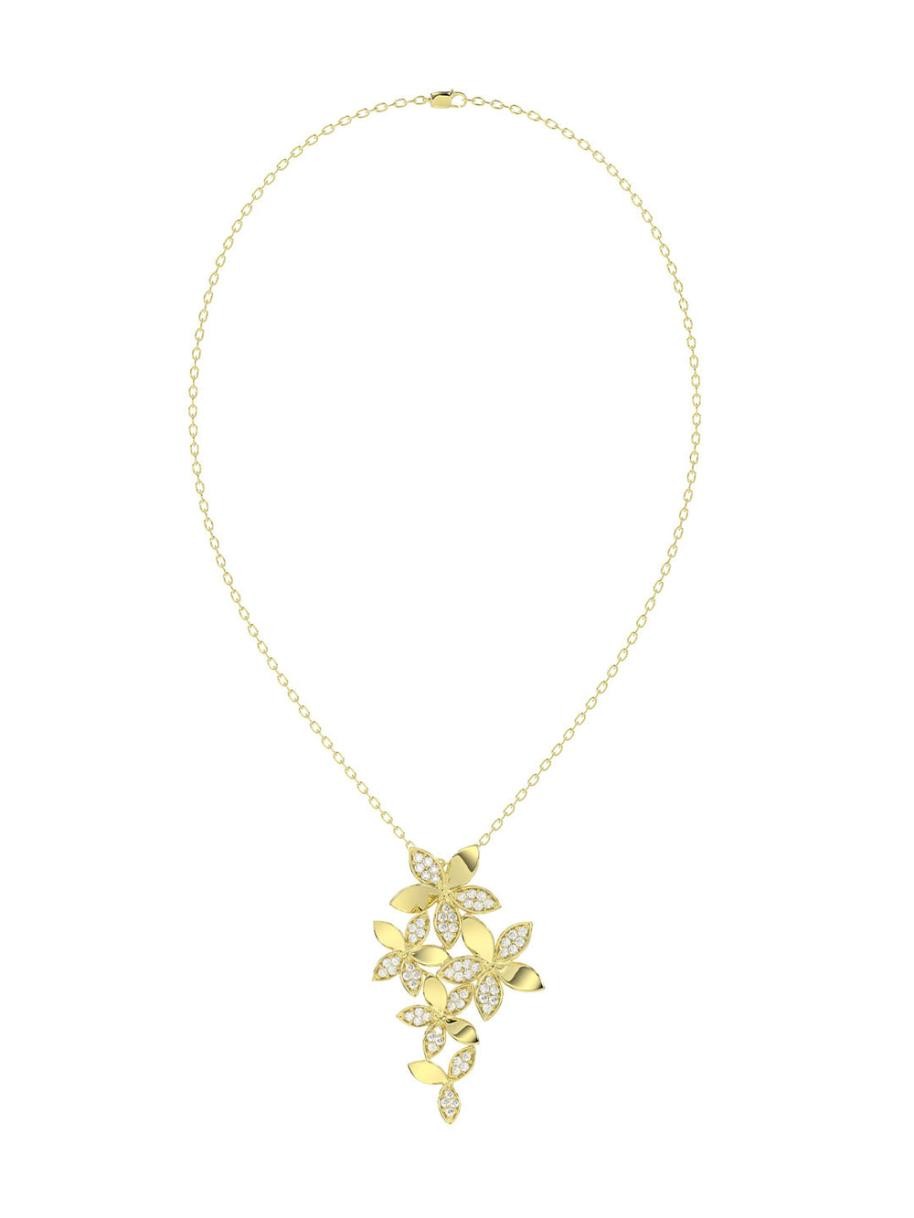 와일드 플라워 옐로 골드 펜던트 목걸이는 18캐럿 옐로 골드 소재의 섬세한 체인으로, 역동적인 눈물방울 모양의 다이아몬드와 옐로 골드 꽃으로 구성된 펜던트가 특징입니다. 다양한 꽃들이 모여 마치 무중력으로 떠 있는 듯한 착시 효과를 연출합니다.