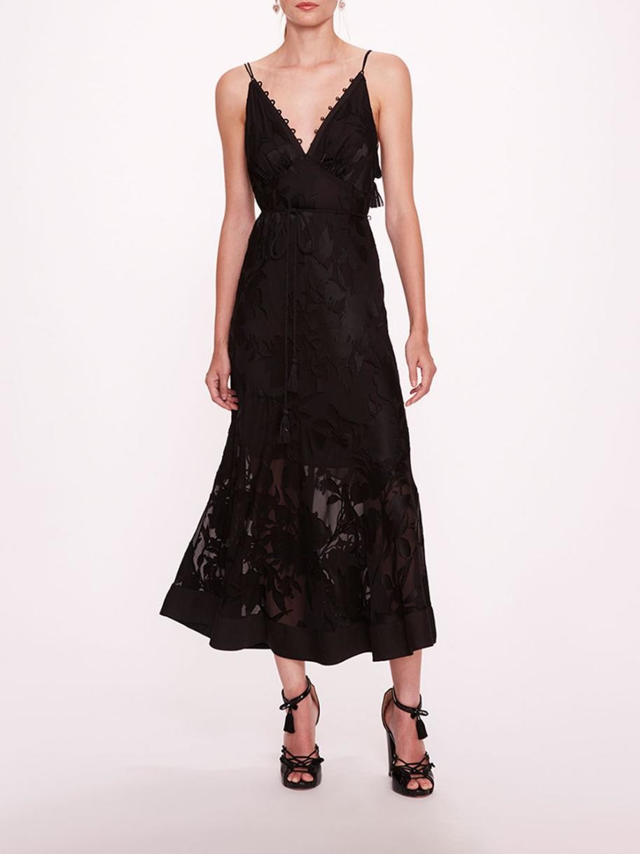 니오베 슬립 드레스는 V넥과 태슬 스트랩이 특징인 바이어스 슬립 드레스입니다. 번아웃 새틴 소재로 제작되었으며, 단추 디테일과 별도의 태슬 로프 벨트가 특징입니다.