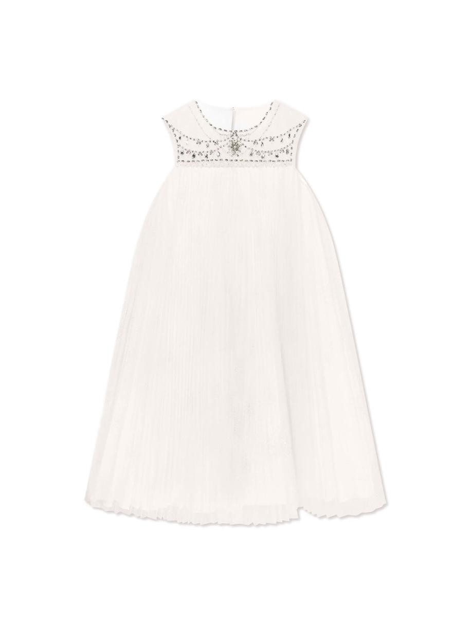 Den juvelprydda tyllklänningen är en medellång klänning tillverkad av krämfärgad tyll. Babydoll-klänningen har en hög rund halsringning utsmyckad med stenar i olika former och storlekar. Klänningens kropp är soluppgångsveckad, perfekt för oändliga snurrningar.
