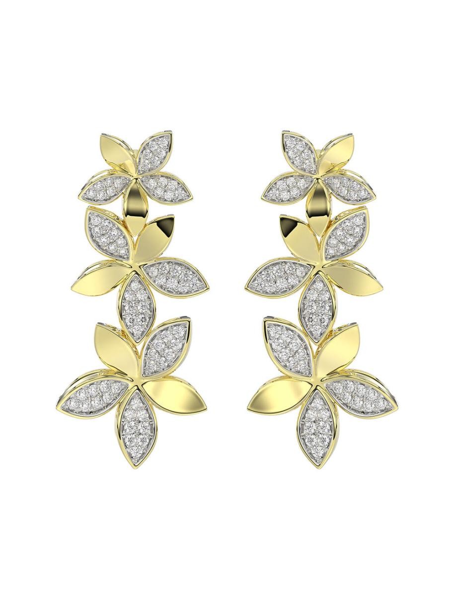 Örhängena i gult guld med vilda blommorhar dynamiska droppformade diamantblad infattade i gult guld. Kronblad i massivt gult guld är utspridda bland de naturliga diamanterna.