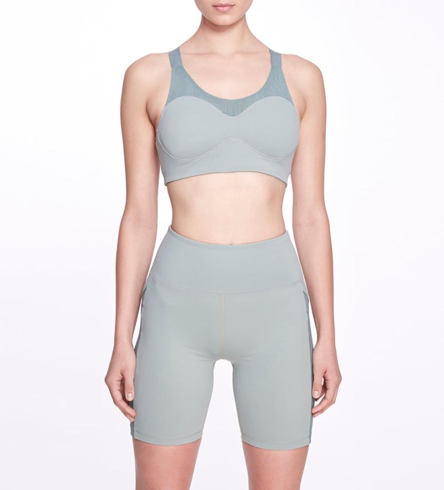 Olivia-bh:n har en djup U-ringning och brottarrygg. Denna sporttopp i färgen 'Sage' kan bäras ensam eller med 'Sage' Olivia Shorts som en del av ett elegant matchande set.