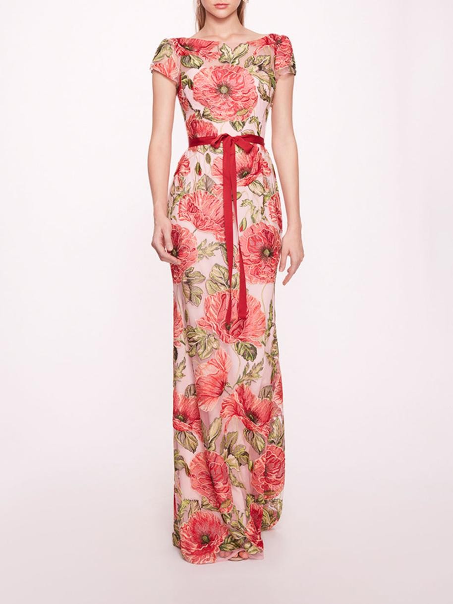 Marchesa-klänningar för kvinnor | Broderad klänning med båtringning i röd/rosa