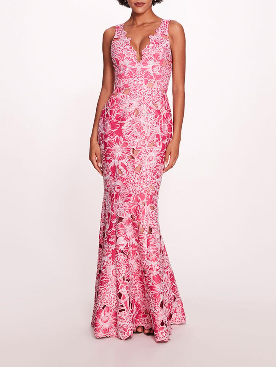 The Anthousai Gown is a plunging v-neck gown with a fit-to-flare silhouette on anthousai cutwork fabric.