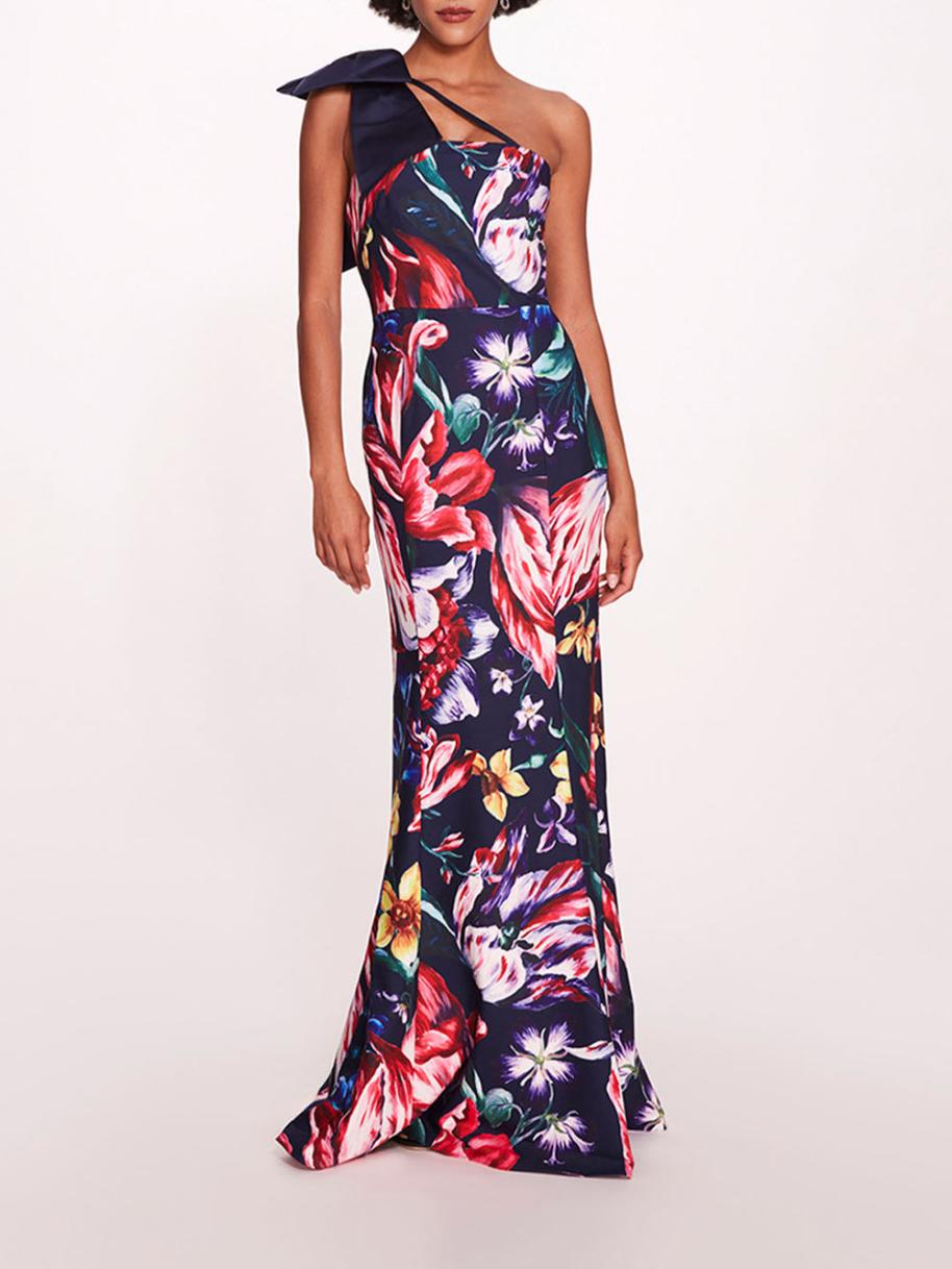 The Florilegium Gown is a floral print fit-to-flare one shoulder crepe gown with an open bow detail on the shoulder.