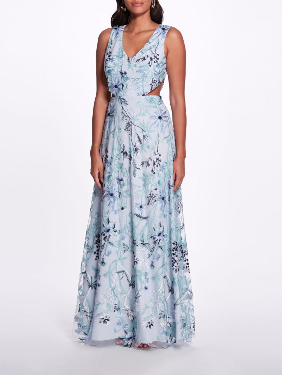 Women Marchesa Dresses | Keyhole Back Floral Gown Slate Blue