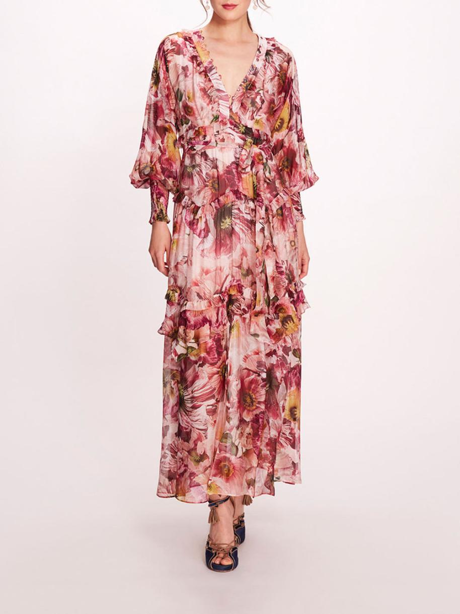 The Leilani Dress is a maxi swing dress featuring a v-neckline and dolman sleeve. Leilani is crafted with silk viscose and completed with ruffles, smocked cuffs, button details, and a separate belt.
