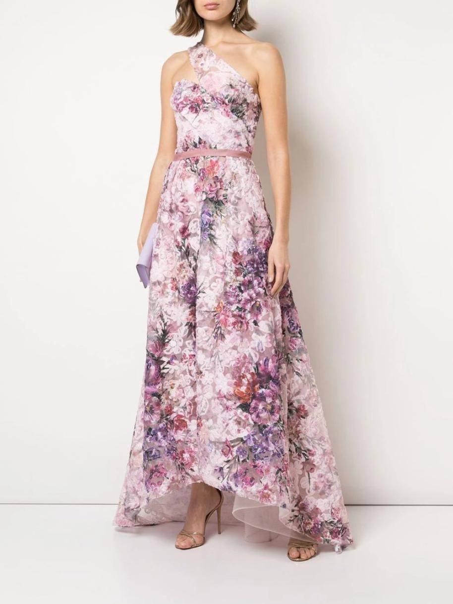 All eyes will be on you at your next event in this One-Shoulder Pleated Soutache Hi-Low Gown. Featuring a striking floral printed pleated soutache, a daring one-shoulder design, a glamorous hi-lo hem and a refined cinched waist.