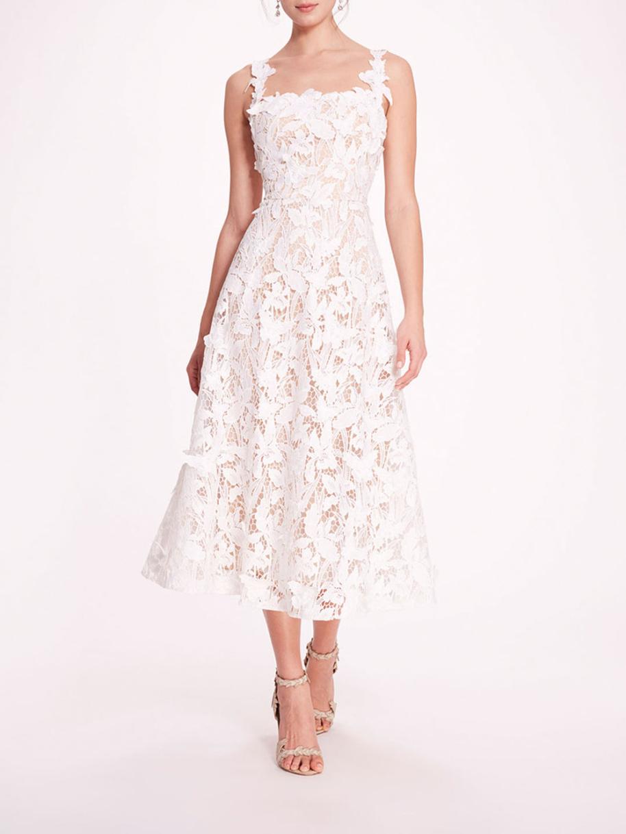 Elevate your cocktail attire with the Organic Lace Midi Dress. Crafted from guipure lace, this sleeveless a-line silhouette is adorned with intricate 3-D appliqués.