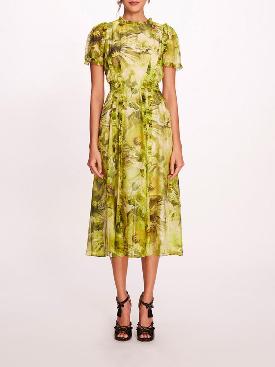 The Sedum Dress is a midi a-line dress featuring a mock neckline and ruffled short sleeve. Sedum is crafted with silk viscose and completed with smocking details at the waist.