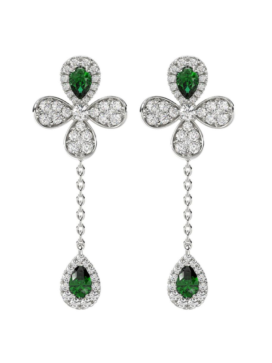 A refined nod to the good luck charm, the Floral White Gold Drop Earrings feature a four-leaf diamond clover set in white gold, followed by a teardrop-shaped natural emerald with pavé diamonds.