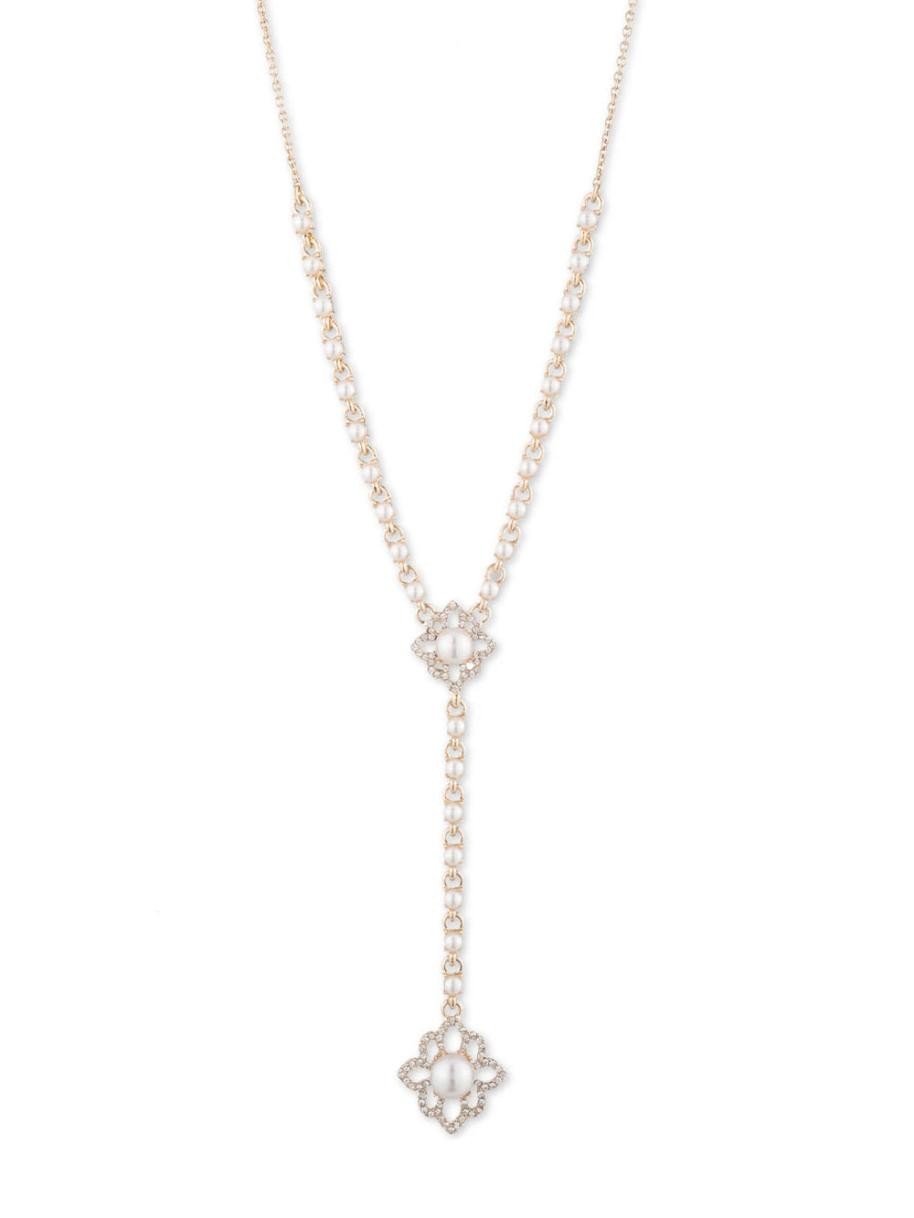 The Pretty Pearl Y Necklace features a pattern of petite gold links and faux pearls, complete with geometric floral charms. The statement gold necklace is featured in a gold tone with gold hardware and measures 16 inches in length.