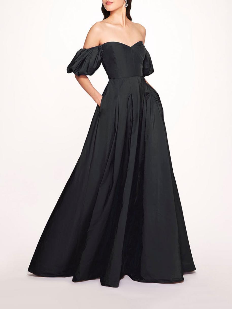Constructed with voluminous taffeta, the Balloon Sleeve Taffeta Gown is an a-line gown featuring an off shoulder sweetheart neckline, short balloon sleeves, fitted bodice, and pleated flowing skirt.