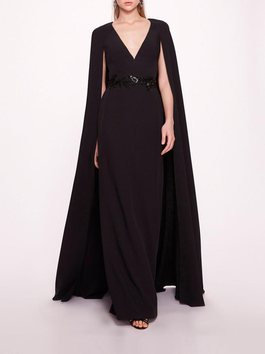 The Embroidered Belt Kaftan is a floor length cape gown with a deep v-neckline and embroidery detailing on the waist.