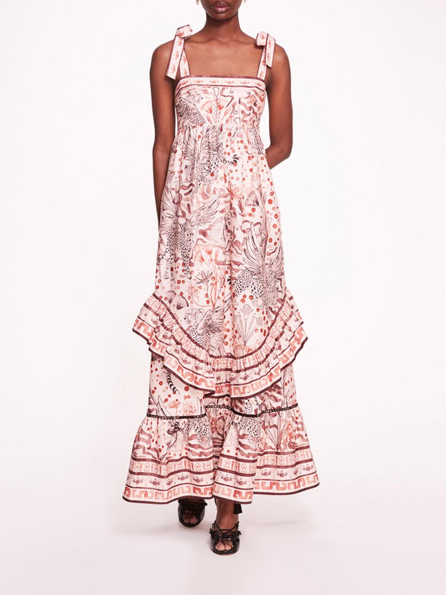 The Flying Cheetah Maxi Dress enchants with its captivating details, adorned with cascading ruffles and adjustable tied shoulder bows. Crafted from poplin printed with winged leopards and abstract watercolor animal print, the sleeveless maxi dress is complete with smocking details.
