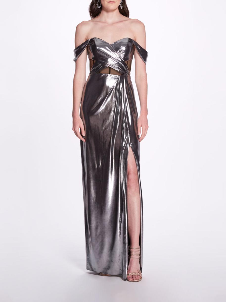 Women Marchesa Dresses | Metallic Cutout Off Shoulder Gown Gunmetal